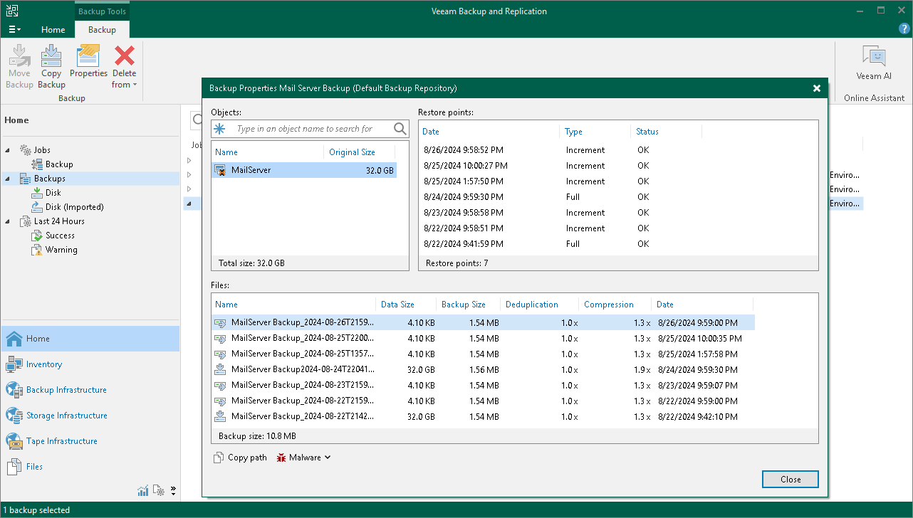 After a backup job successfully creates a VM backup according to the specified schedule, or after you create an active full VM backup manually, the backup is displayed under the Backups node in the Home view of the Veeam Backup & Replication console. Each backup is represented with a set of properties, such as: