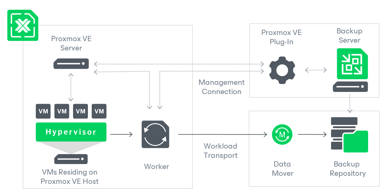 Proxmox VE Plug-in is an architecture component that enables integration between the backup server and the Proxmox VE server. Proxmox VE Plug-in also allows the backup server to deploy and manage workers.