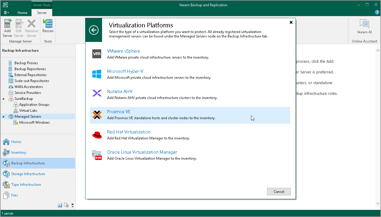 - In the Virtualization Platforms window, select Proxmox VE to launch the New Proxmox VE Server wizard.