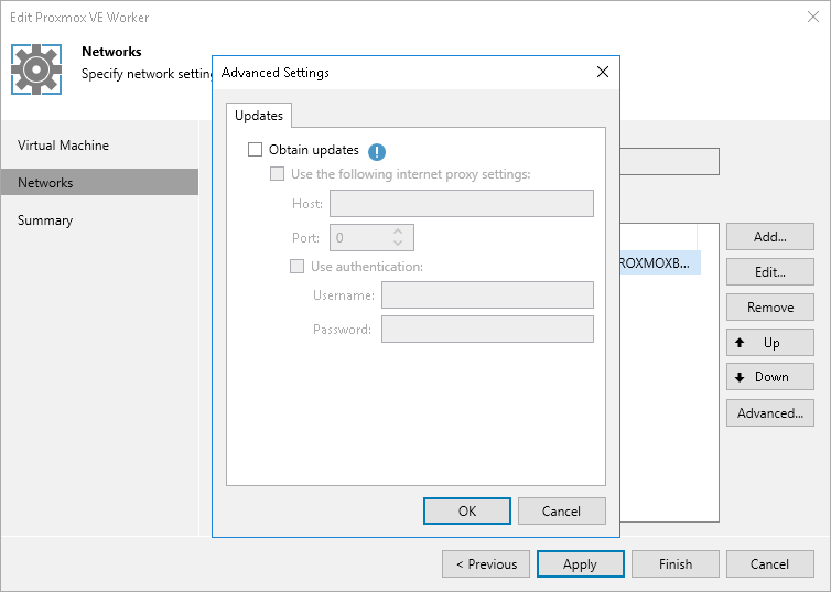 - At the Networks step of the Edit Proxmox VE Worker wizard, click Advanced and clear the Obtain updates check box. Then, click Finish to save changes made to the worker settings.