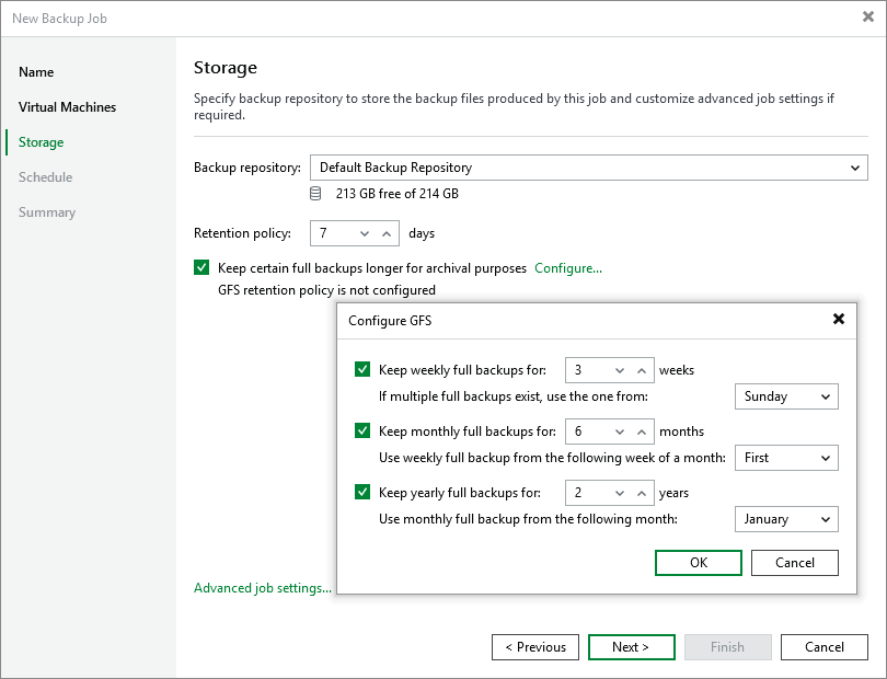 To configure a GFS policy schedule, select the Keep certain full backups longer for archival purposes check box and click Configure. Then, specify the following options in the Configure GFS window: