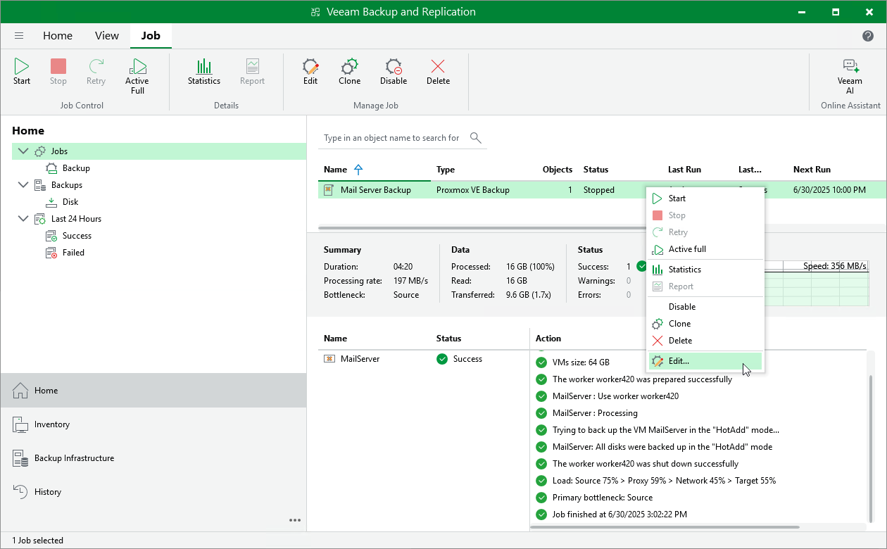 - To change the backup repository where backups are stored, to configure backup job retention settings, to schedule active and synthetic full backups, to configure health checks and email notifications, follow the instructions provided in section Creating Backup Jobs (step 4).