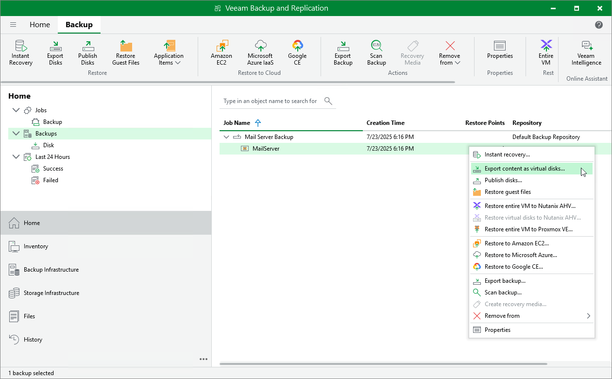 - In the working area, expand the necessary backup job, right-click the VM that contains disks you want to export and select Export content as virtual disks.
