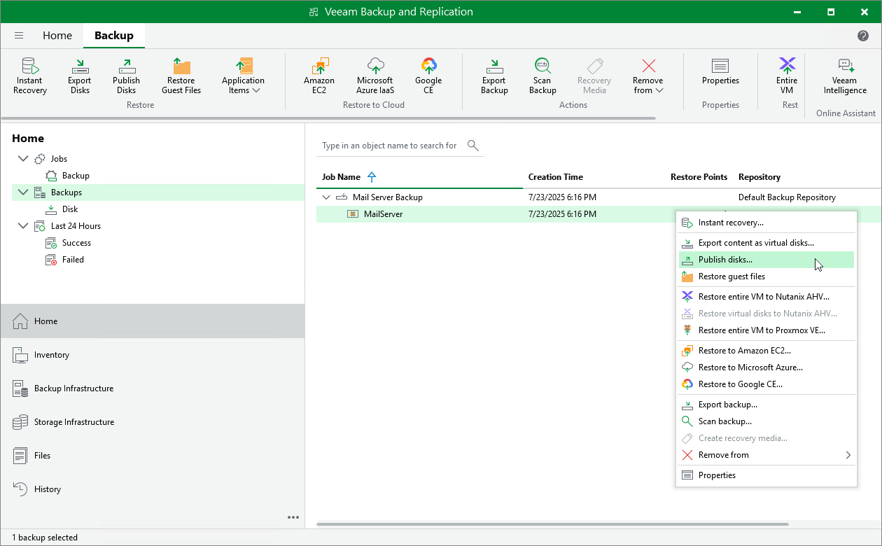 3. In the working area, expand the necessary backup job, right-click the VM that contains disks you want to mount and select Publish disks.