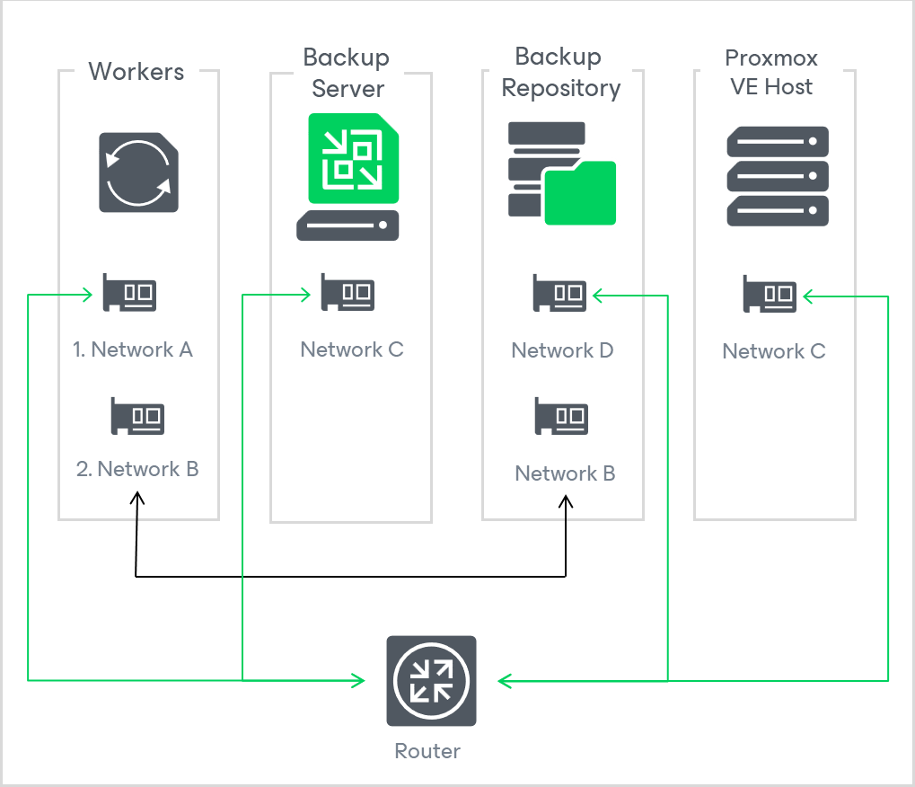 Veeam Plug-in for Proxmox VE allows you to connect workers to multiple networks. This may be helpful if your corporate policies require that inbound and outbound internet traffic is delivered through a secure network only, or if you want to use a specific network to transfer backed-up data from and to backup repositories.