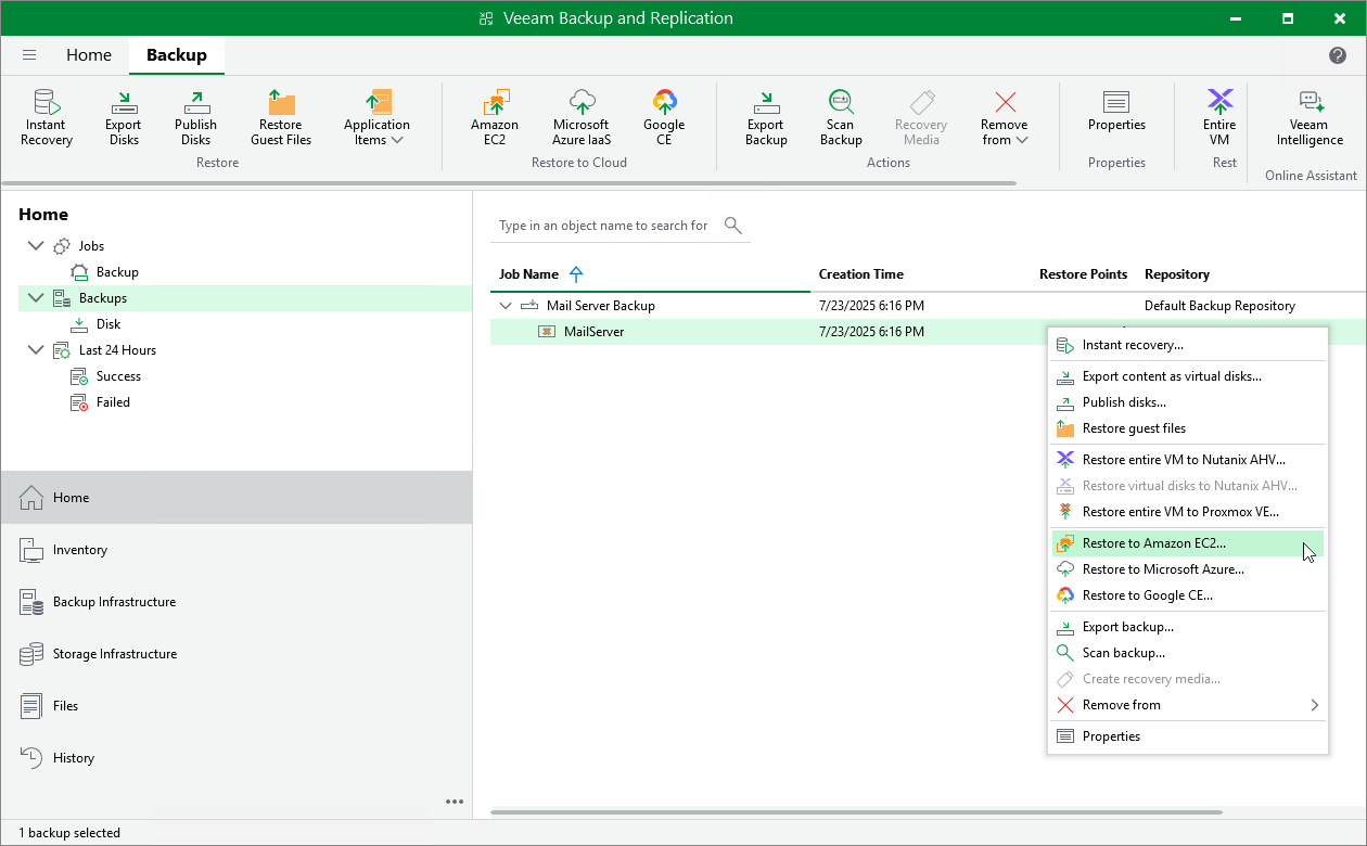 - In the working area, expand the necessary backup job, right-click the VM that you want to restore and select Restore to Amazon EC2.