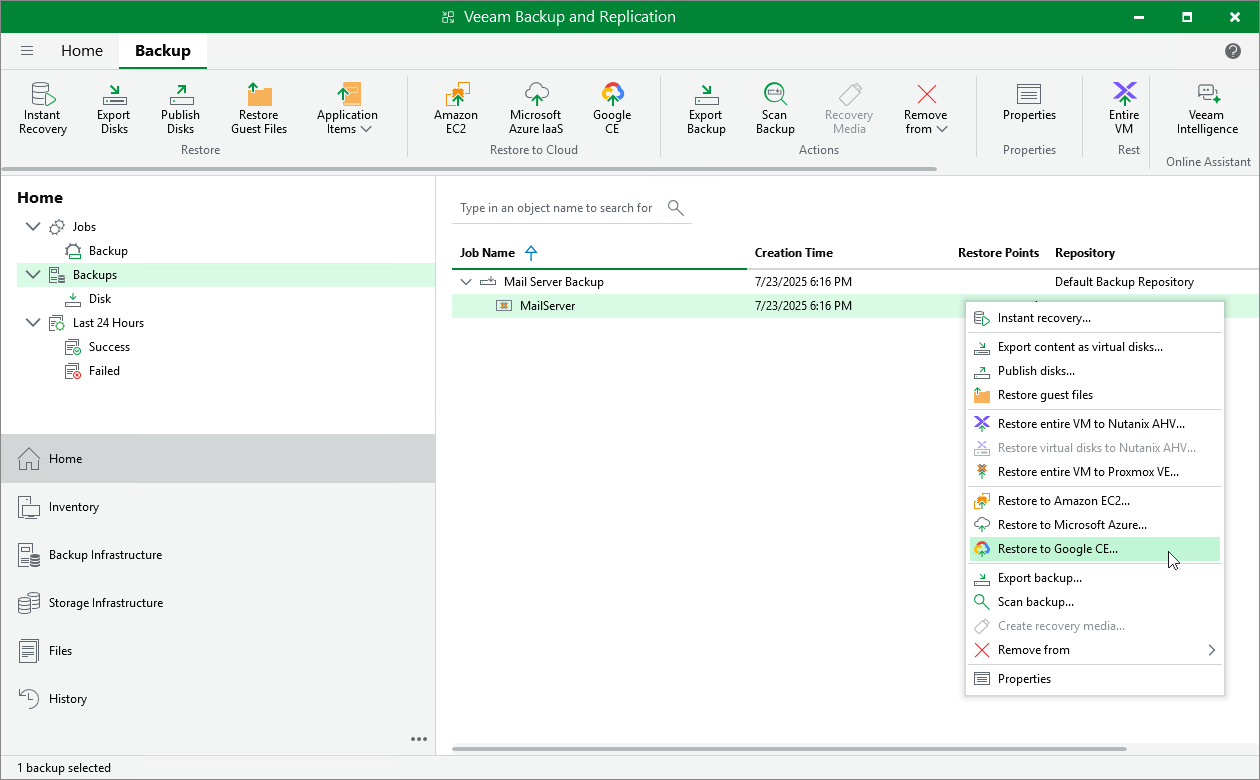 - In the working area, expand the necessary backup job, right-click the VM that you want to restore and select Restore to Google CE.