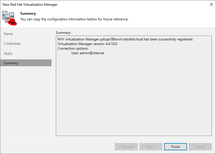 At the Summary step of the wizard, check that the RHV manager has been successfully added and click Finish.