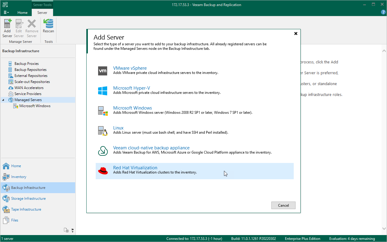- In the Add Server window, select Red Hat Virtualization to launch the New Red Hat Virtualization Manager wizard.