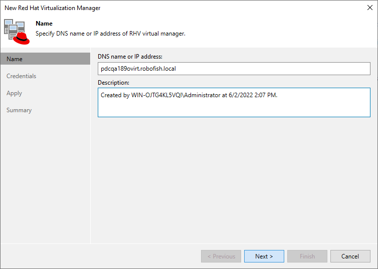 Step 2. Specify Domain Name or IP Address of RHV Manager