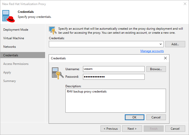 For credentials to be displayed in the Credentials list, they must be added to the Credentials Manager as described in the Veeam Backup & Replication User Guide, section Standard Accounts. If you have not added the necessary credentials to the Credentials Manager beforehand, you can do this without closing the New Red Hat Virtualization Proxy wizard. To add credentials, do the following: