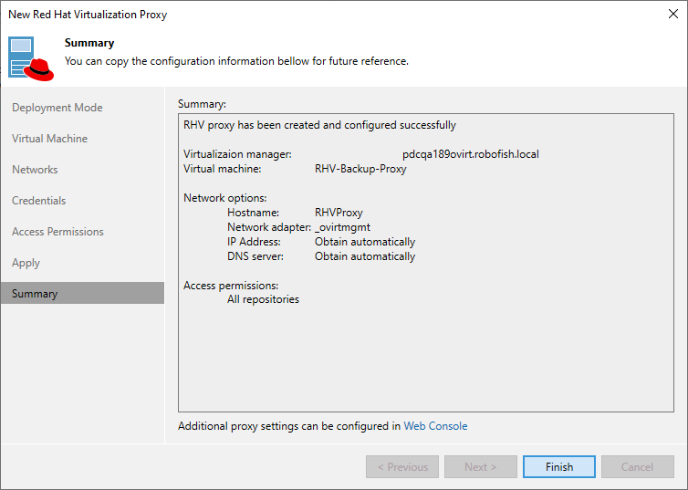 At the Summary step of the wizard, review summary information and click Finish. To open the RHV backup proxy web console in your web browser, click Web Console.