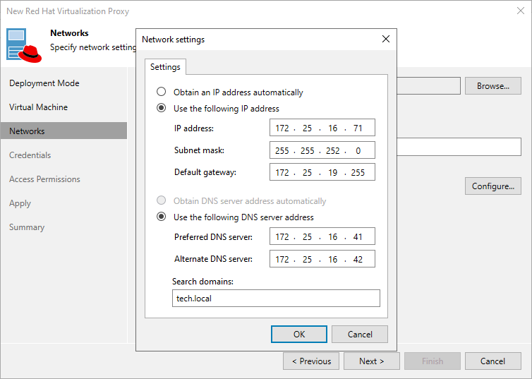 - If DHCP is enabled for the selected network adapter, the IP address and DNS settings of the RHV backup proxy can be obtained automatically.