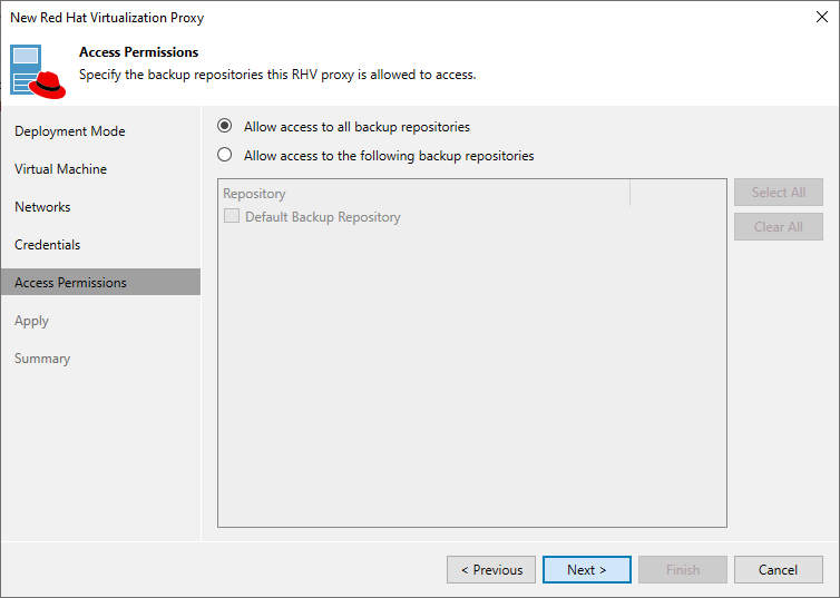 • Select the Allow access to all backup repositories option if you want the RHV backup proxy to have access to all backup repositories added to the backup infrastructure.