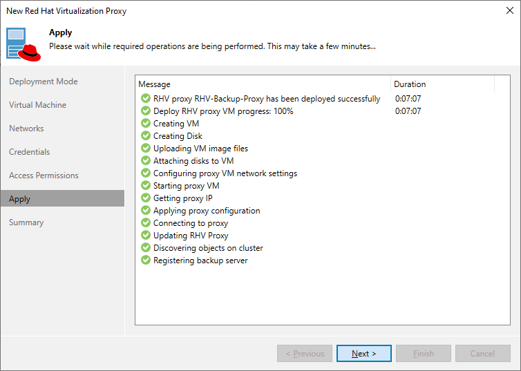 At the Apply step of the wizard, wait for the RHV backup proxy to be added to the backup infrastructure and then click Next.