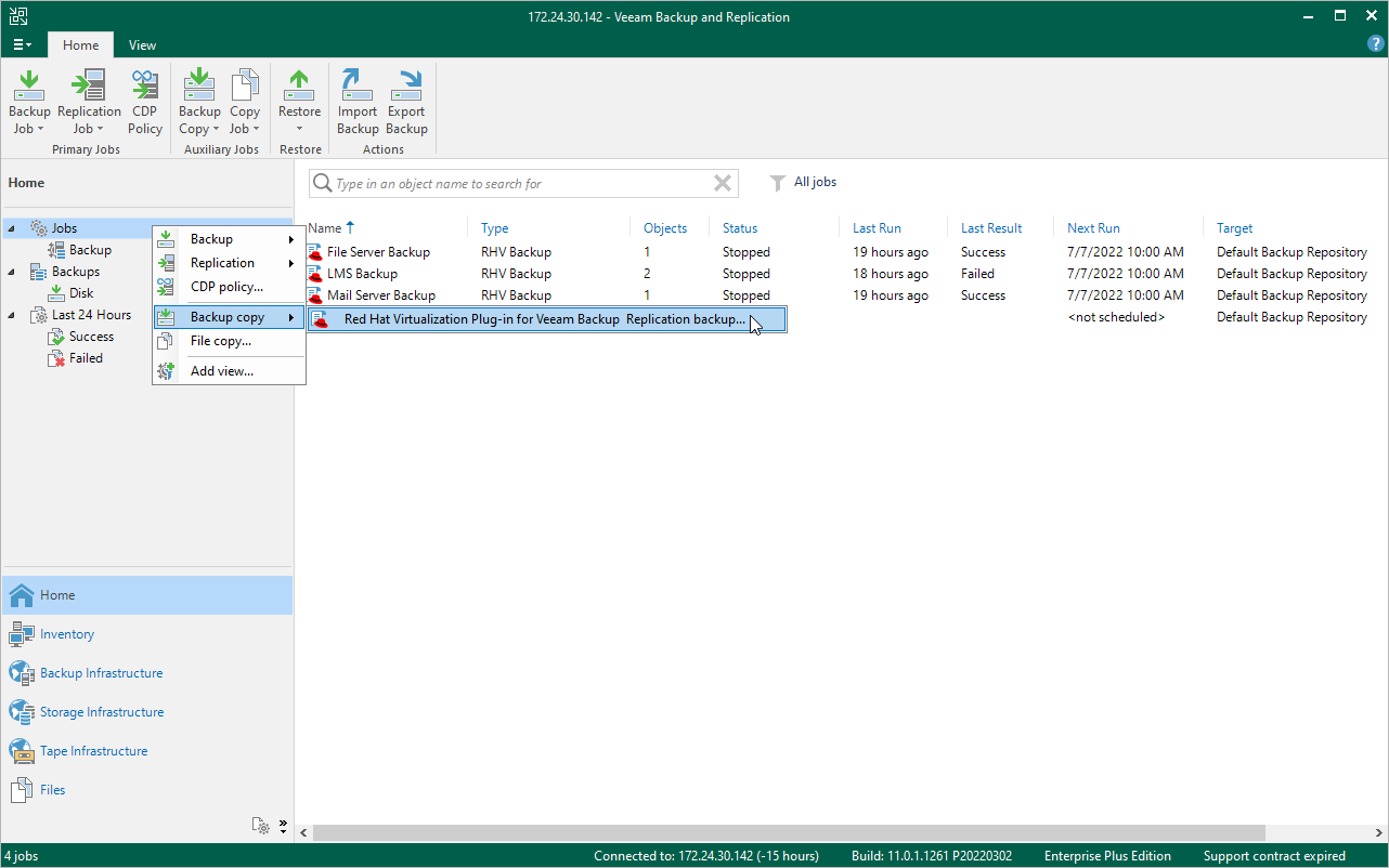 - In the inventory pane, right-click Jobs and select Backup Copy > Red Hat Virtualization Plug-in for Veeam Backup & Replication backup.