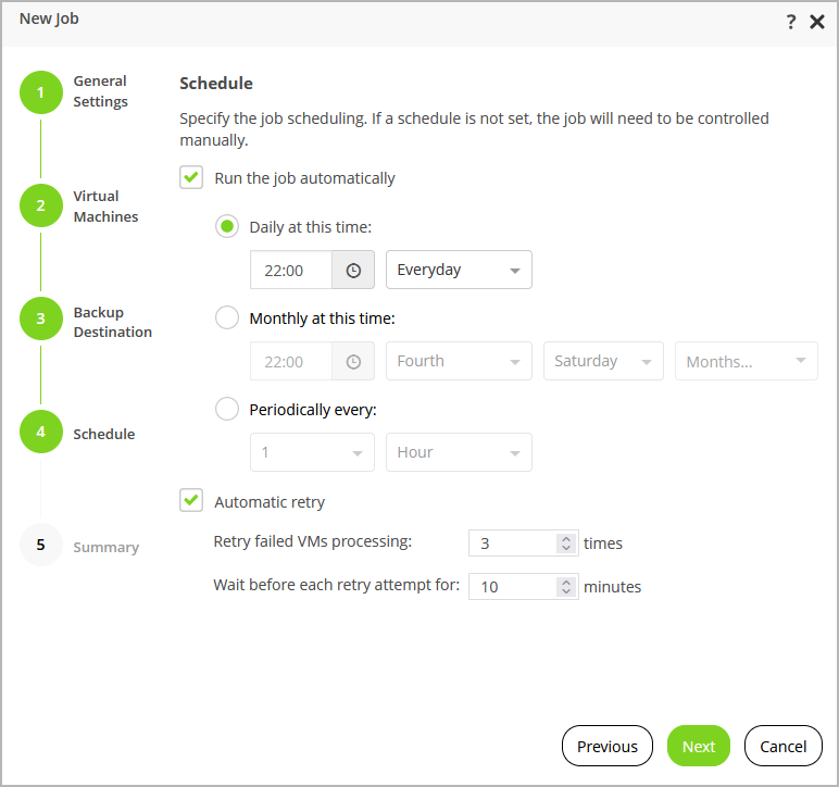 At the Schedule step of the wizard, you can instruct Veeam Backup for RHV to start the backup job automatically according to a specific backup schedule. The backup schedule defines how often data of the VMs added to the backup job will be backed up.