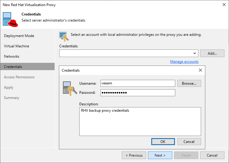 For credentials to be displayed in the Credentials list, they must be added to the Credentials Manager as described in the Veeam Backup & Replication User Guide, section Standard Accounts. If you have not added the necessary credentials to the Credentials Manager beforehand, you can do this without closing the New Red Hat Virtualization Proxy wizard. To add credentials, do the following: