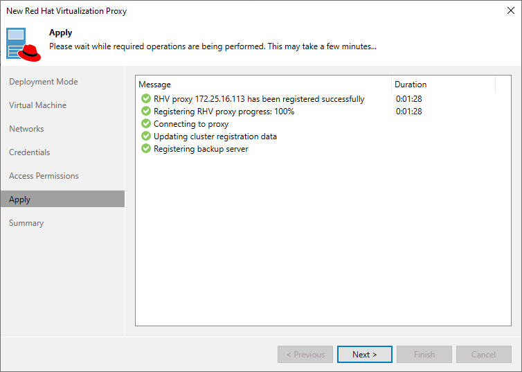 At the Apply step of the wizard, wait for the RHV backup proxy to be added to the backup infrastructure and then click Next.
