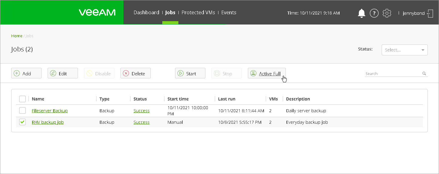 - Select the necessary backup job and click Active Full.
