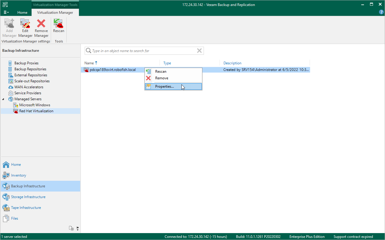 To edit properties of the RHV manager added to the backup infrastructure, do the following: