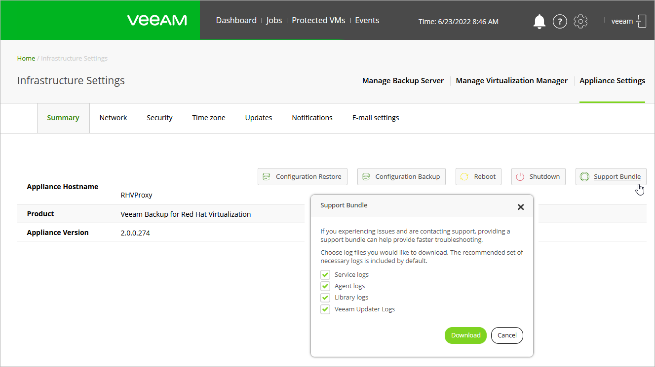 - In the Support Bundle window, choose whether you want to collect logs for the Veeam Backup Agent service, Veeam Data Mover service, Veeam internal API service and Veeam Updater service.