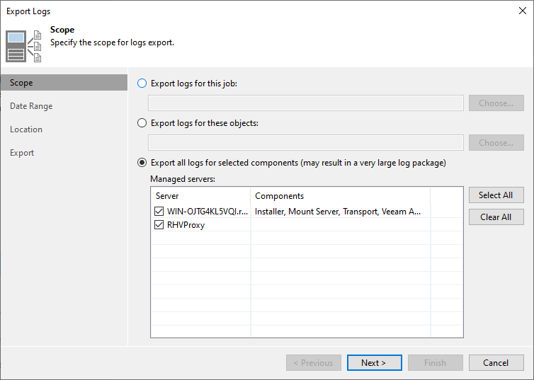 - At the Scope step of the Export Logs wizard, select the Export all logs for selected components option. Then, in the Managed servers list, select the backup server and the VM running as the RHV backup proxy.