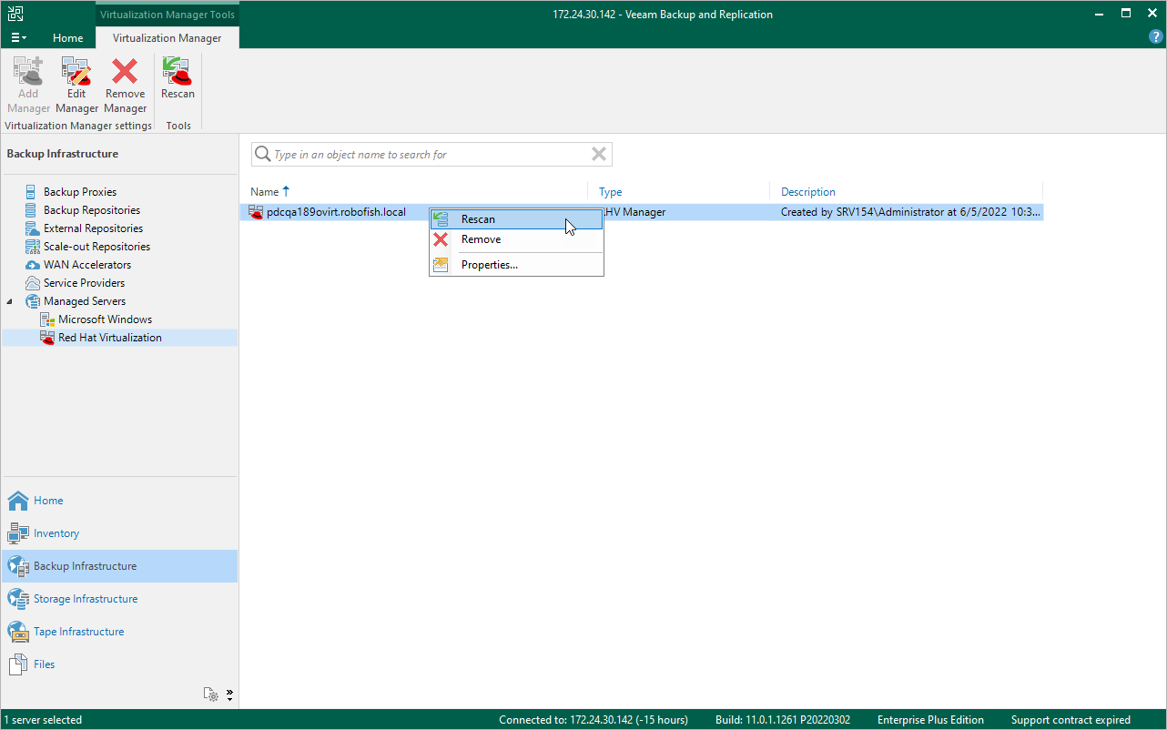 Veeam Backup for RHV retrieves information about the protected RHV infrastructure from the RHV manager. However, the data synchronization process may take some time to complete. If you make any changes to the RHV infrastructure and want both the Veeam Backup & Replication console and the RHV backup proxy web console to display the changes immediately, you can rescan the RHV manager manually.
