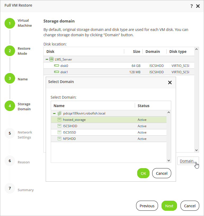 At the Storage Domain step of the wizard, choose a storage domain where virtual disks of the recovered VM will be stored.