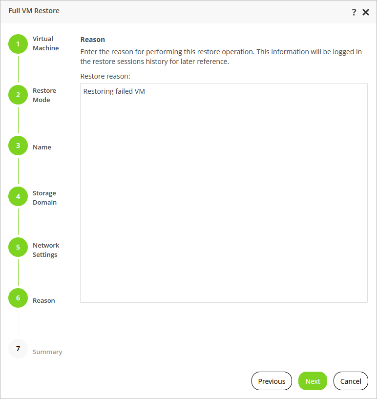 At the Reason step of the wizard, specify a reason for restoring the VM. This information will be saved to the session history, and you will be able to reference it later.