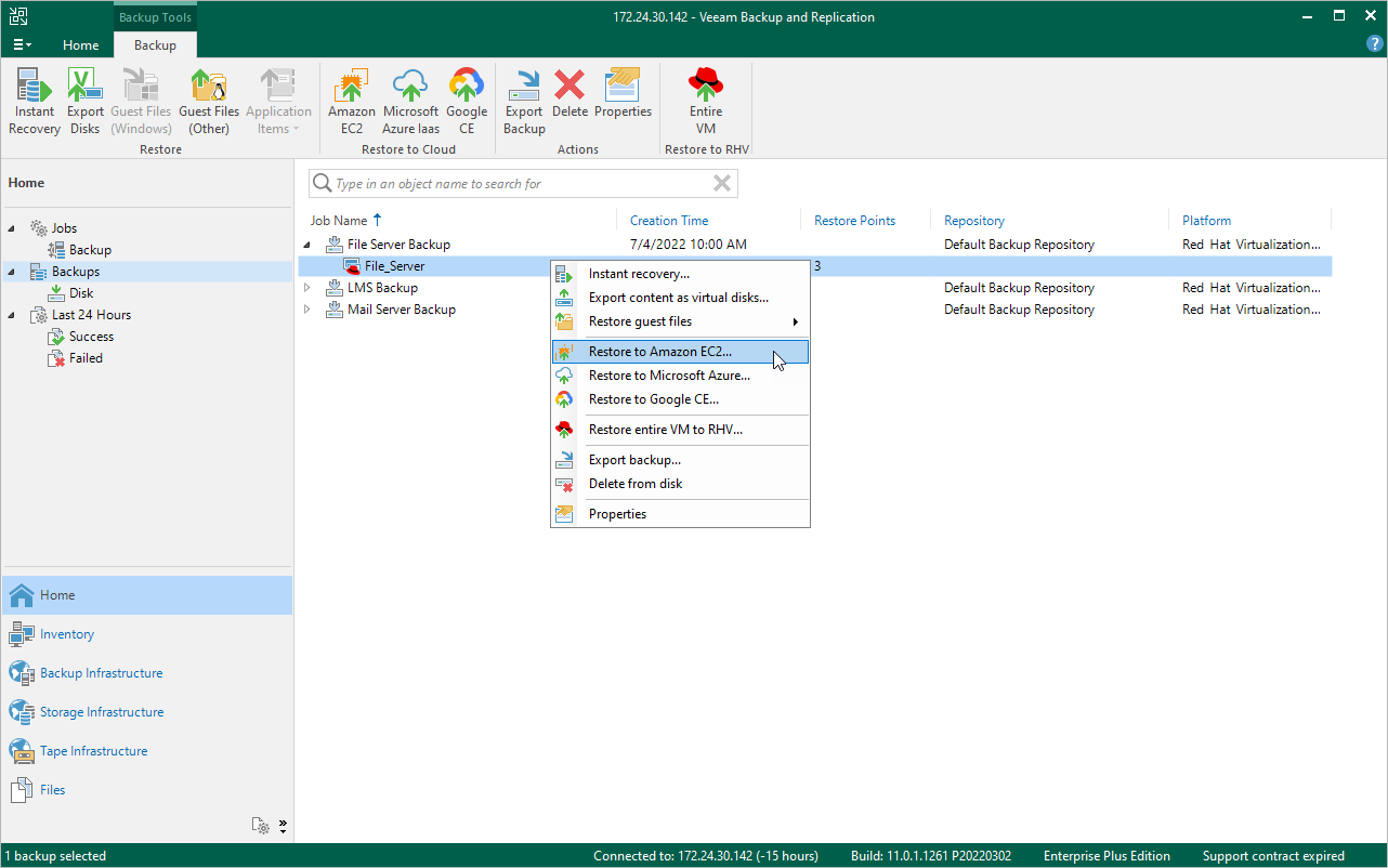 - In the working area, right-click the VM that you want to restore and select Restore to Amazon EC2.