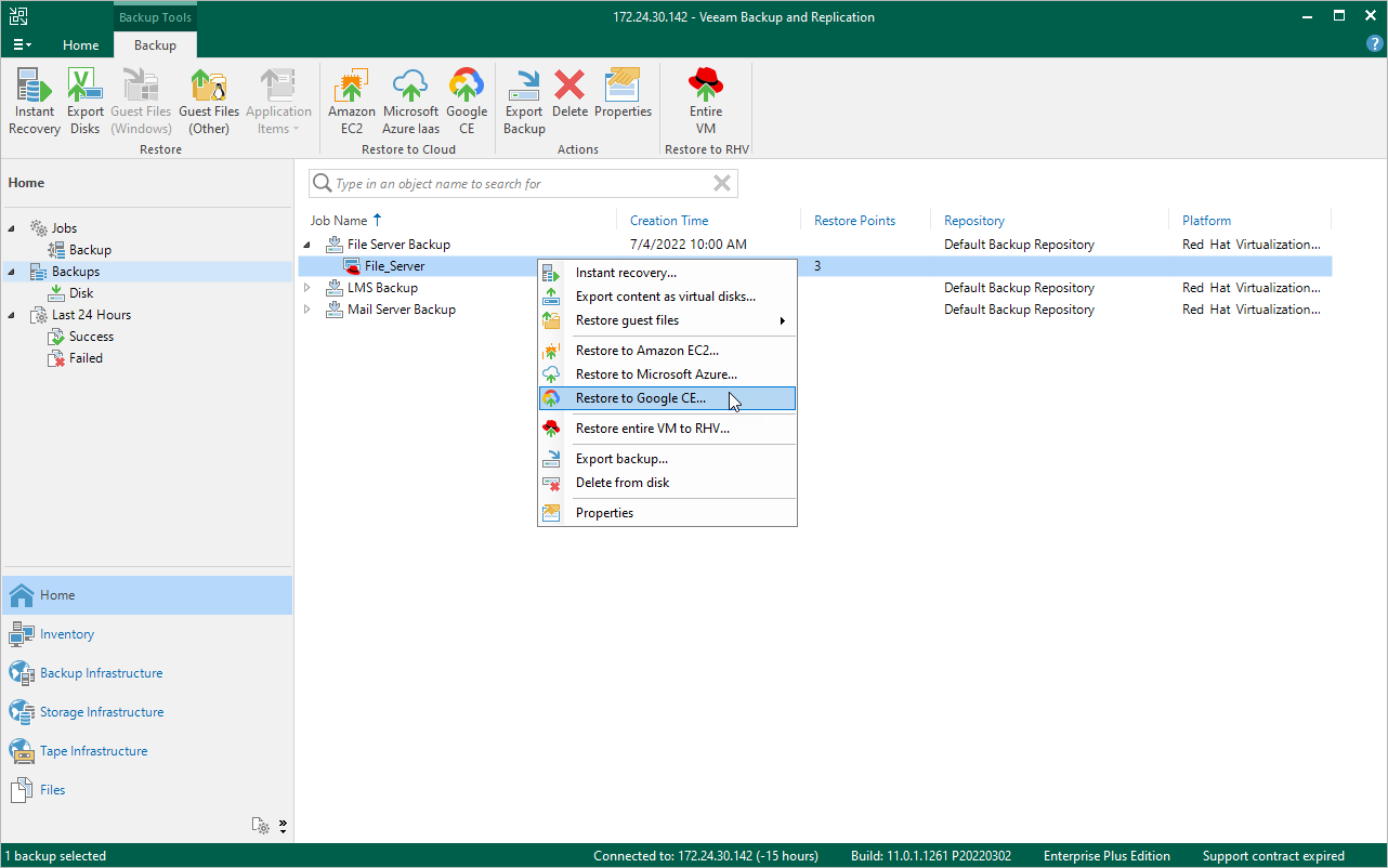 - In the working area, right-click the VM that you want to restore and select Restore to Google CE.