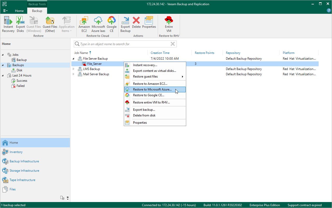 Performing VM Restore to Microsoft Azure