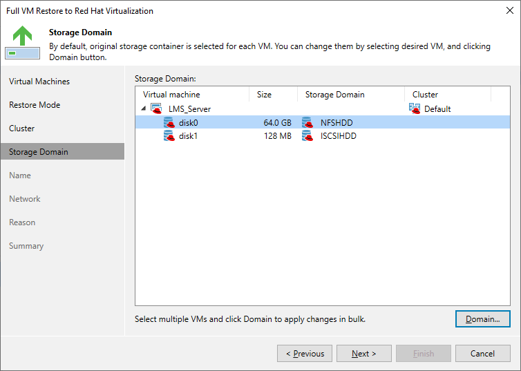 At the Storage Domain step of the wizard, choose the storage domain where virtual disks of the recovered VM will be stored.