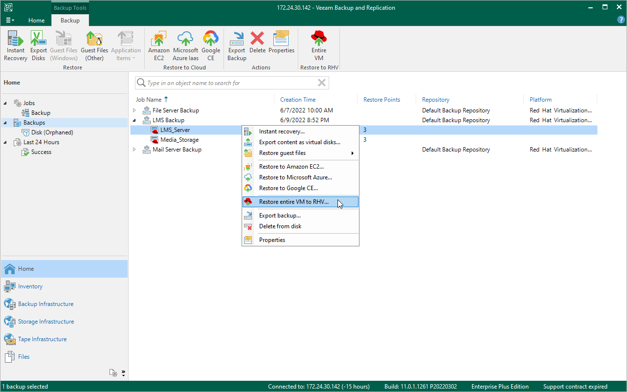 - In the working area, expand the necessary backup, select the VM that you want to restore and click Entire VM on the ribbon, or right-click the VM and select Restore entire VM to RHV.