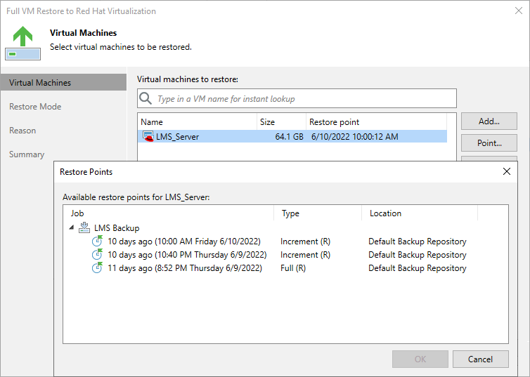 At the Virtual Machines step of the wizard, select a restore point that will be used to restore the selected VM. By default, Veeam Backup for RHV uses the most recent valid restore point. However, you can restore the VM data to an earlier state.