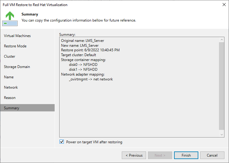 If you want to start the recovered VM as soon as the restore process completes, select the Power on target VM after restore check box. |