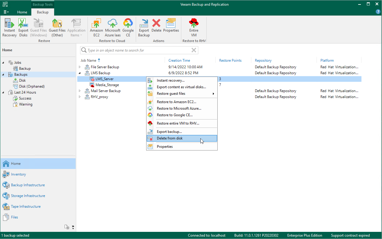 - In the working area, expand the job that created the backup, right-click the VM name and select Delete from disk.