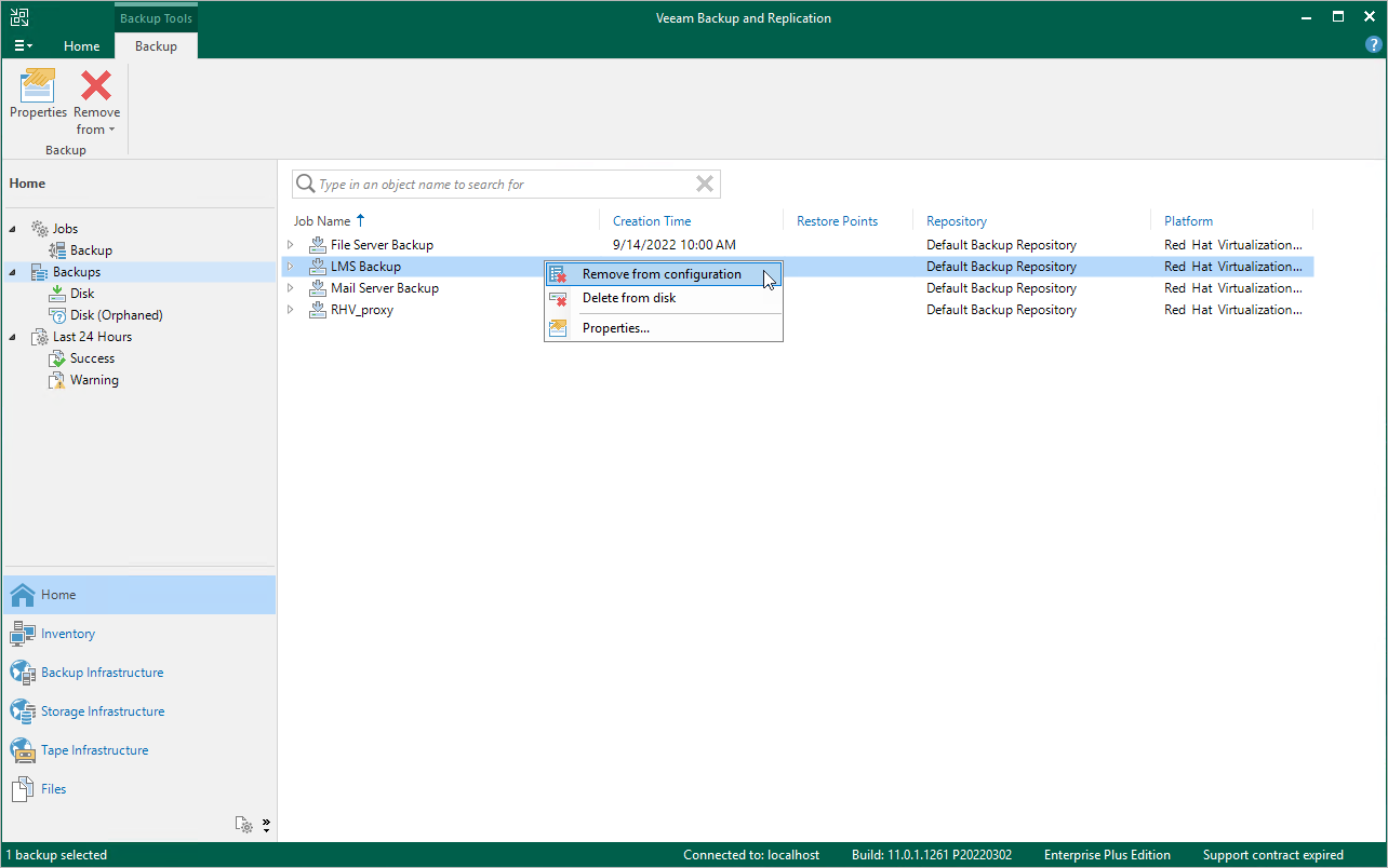 - In the working area, right-click the job that created the backup and select Remove from configuration.