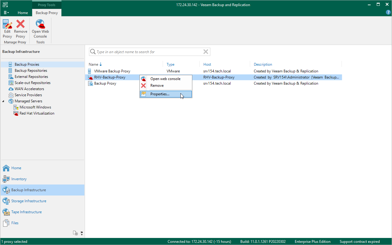 - In the working area, select the RHV backup proxy and click Edit Proxy on the ribbon, or right-click the RHV backup proxy and select Properties.