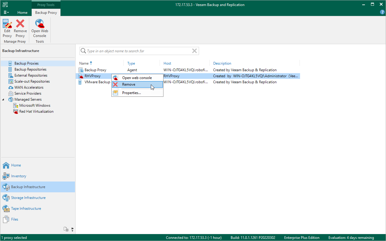 - In the working area, select the RHV backup proxy and click Remove Proxy on the ribbon, or right-click the RHV backup proxy and select Remove.