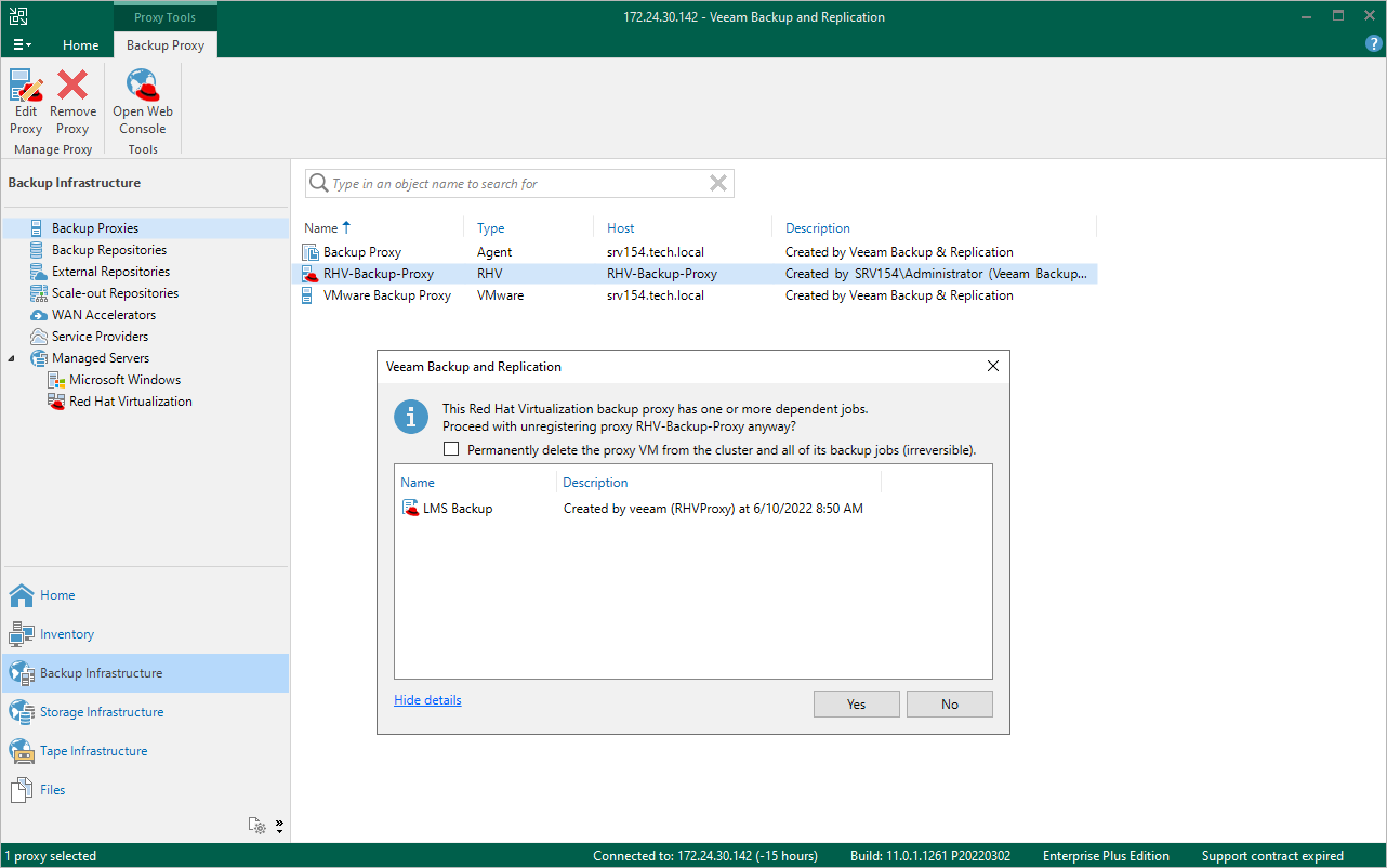 You can remove the RHV backup proxy from the backup infrastructure if you no longer need it and want to add another proxy to the backup server, or if you want to connect this proxy to another backup server.