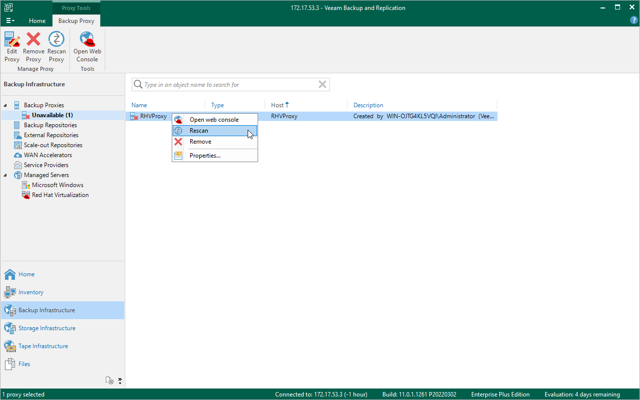 - In the working area, select the RHV backup proxy and click Rescan Proxy on the ribbon, or right-click the RHV backup proxy and select Rescan.