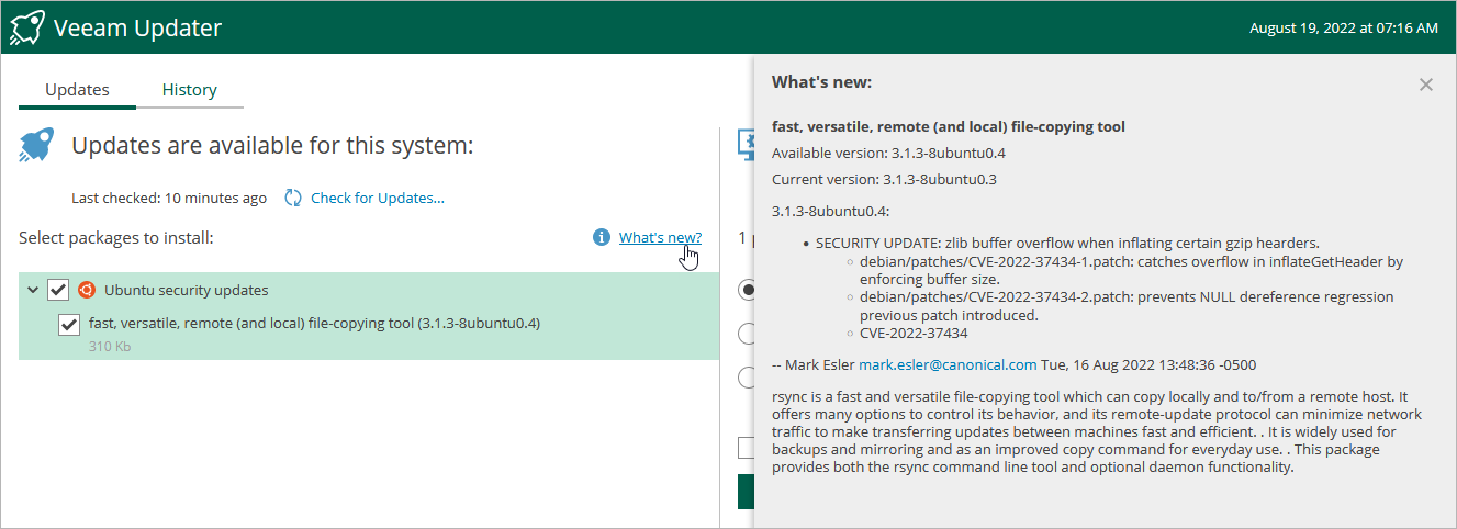If new updates are available, Veeam Backup for RHV will display them on the Updates tab of the Veeam Updater page. To view detailed information on an update, select the check box next to the update and click What's new?