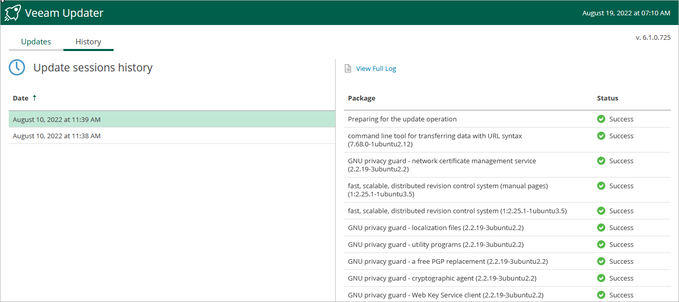 For each date when an update was installed, the Veeam Updater page will display the name of the update and its status (whether the installation process completed successfully, completed with warnings or failed to complete).