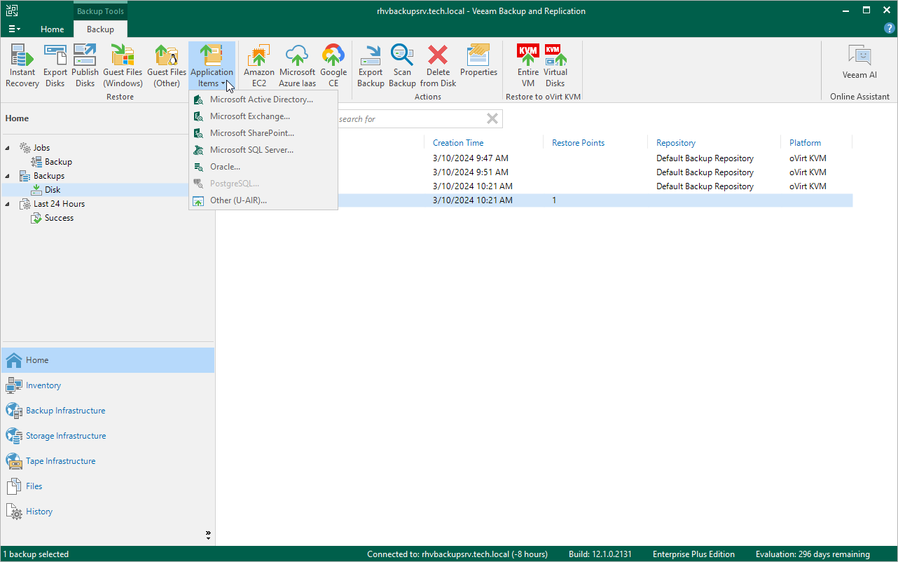 To restore application items from a Veeam Backup for OLVM and RHV VM backup, do the following: