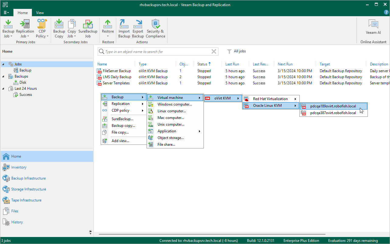 This is an archive version of the document. To get the most up-to-date information, see the current version. Step 1. Launch New Backup Job Wizard In the inventory pane, select Jobs and navigate to Backup > Virtual Machine>oVirt KVM and choose Red Hat Virtualization or Oracle Linux KVM.