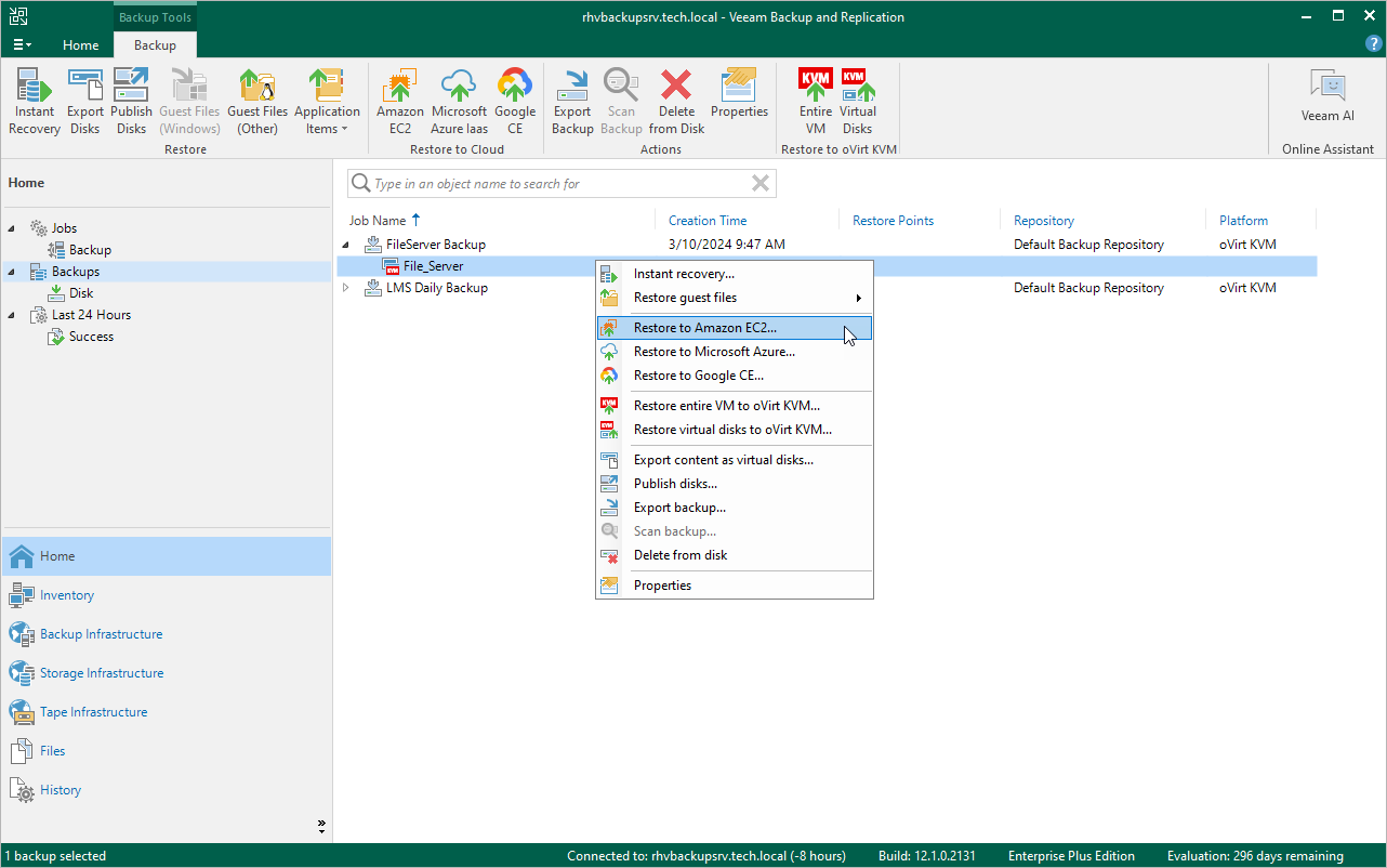 - In the working area, expand the necessary backup job, right-click the VM that you want to restore and select Restore to Amazon EC2.