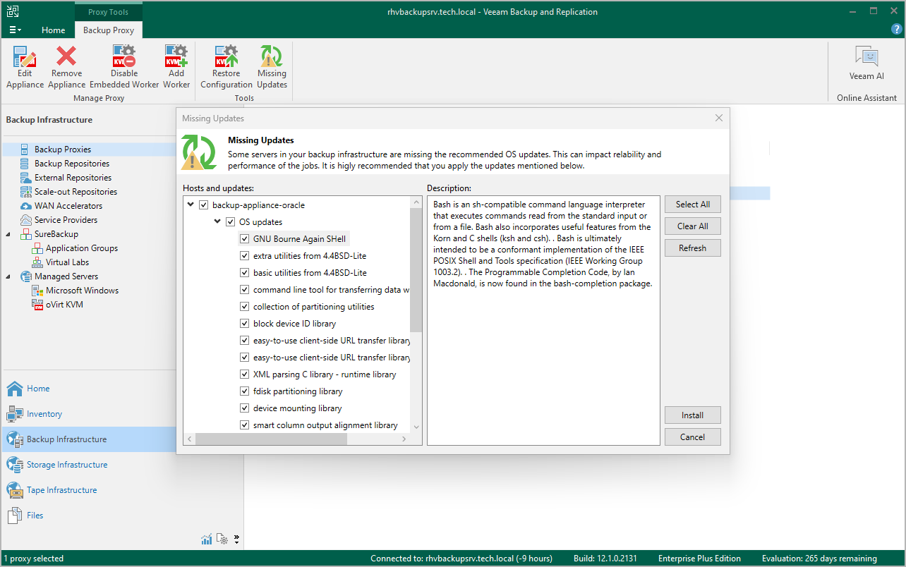 - In the working area, select the backup appliance and click Missing Updates on the ribbon, or right-click the backup appliance and select Missing Updates.