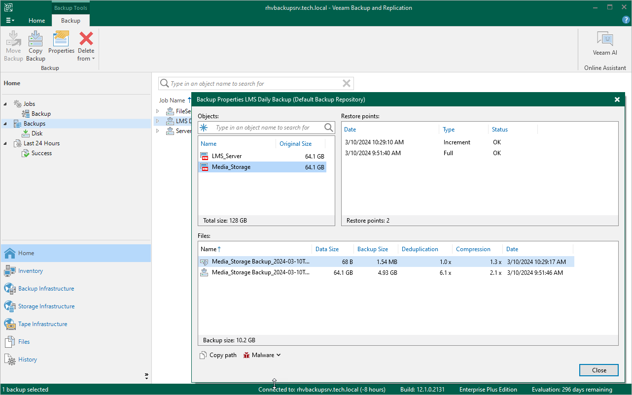 - Files — the size of processed VM data, the size of backed-up VM data, the ratio of data deduplication and the ratio of data compression.